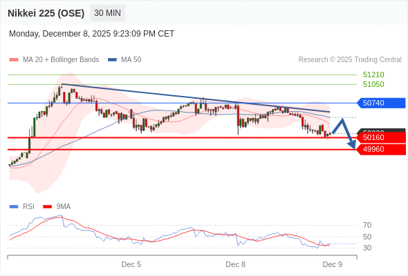 在 50740 之下,看跌,目标价位为 50160 ,然后为 49960 。