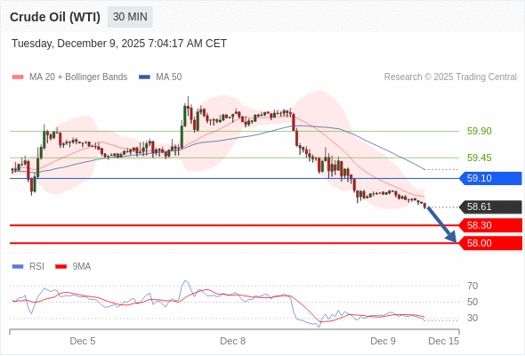 在 59.10 之下,看跌,目标价位为 58.30 ,然后为 58.00 。