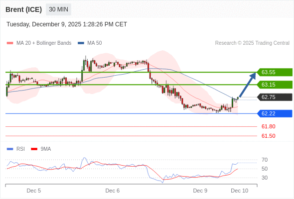 在 62.22 之上,看涨,目标价位为 63.15 ,然后为 63.55 。
