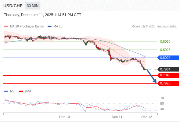 在 0.8000 之下,看跌,目标价位为 0.7945 ,然后为 0.7920 。