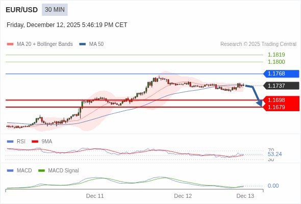 欧元/美元 当日内 : 在进一步下跌之前,反弹至 1.1768 附近。