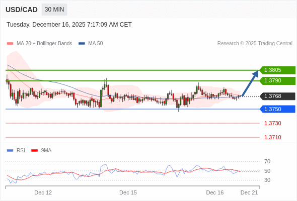 在 1.3750 之上,看涨,目标价位为 1.3790 ,然后为 1.3805 。