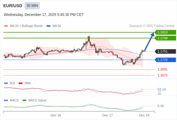 欧元/美元 当日内 : 看涨,当 1.1723 为支撑位。