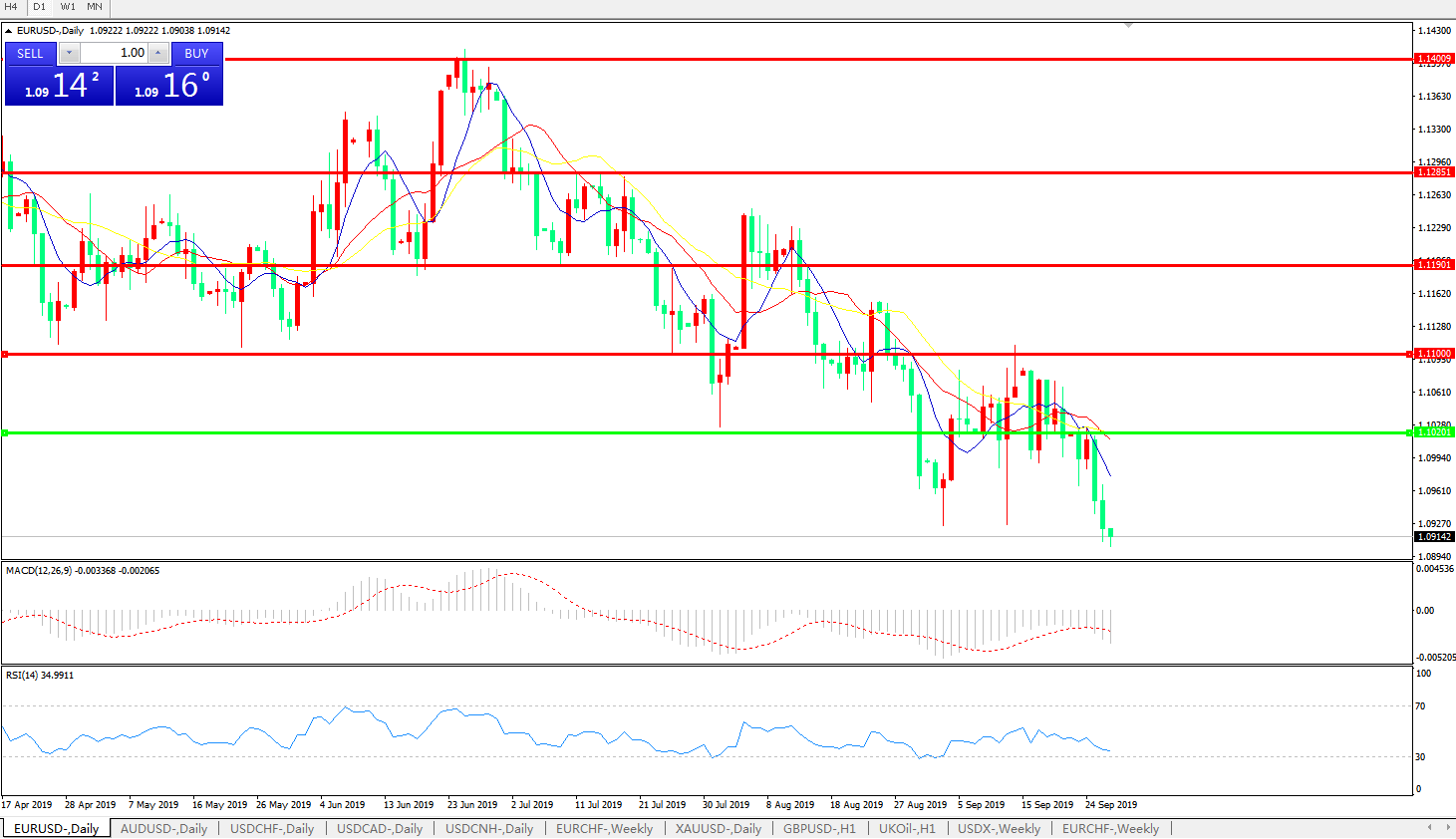 技术面简析:日图均线呈发散下行态势,汇价弱势下行跌破前期低点,MACD再度下行且量能持续放量,RSI震荡走低,预计短期汇价将进一步走弱。