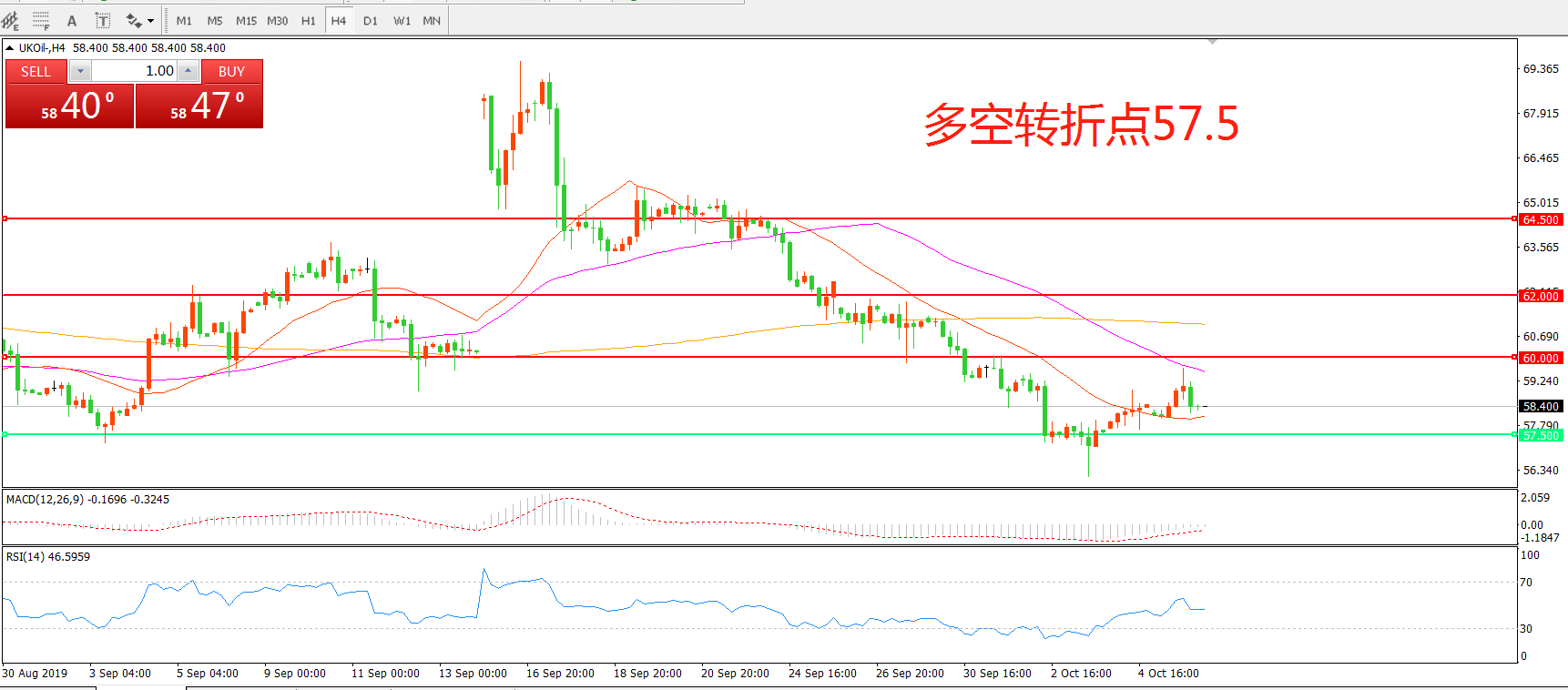 中美将在10月10-10月11日将展开最新一轮贸易磋商,市场交投偏向谨慎,近期一连串疲弱的美国经济数据,包括制造业活动疲弱和服务业成长大幅放缓,加剧了对经济衰退的担忧,市场寄希望于国际贸易谈判取得进展,从而助力油价自上周跌势反弹。布伦特原油(10月7日)周一冲高回落,收报58.40美元/桶。