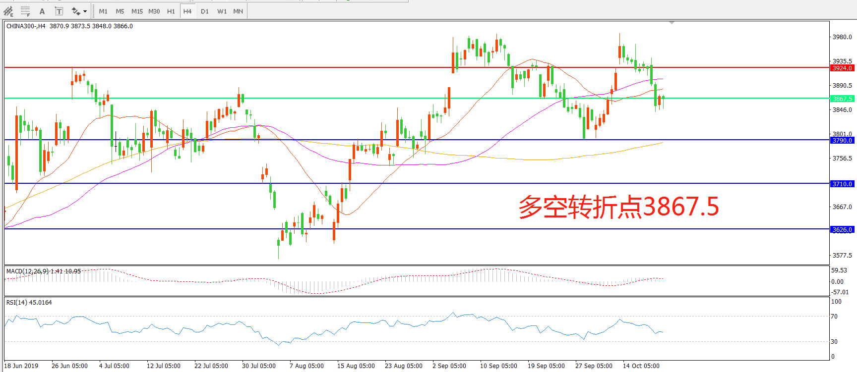 4小时图看,沪深300维持短期震荡,整体走势有止跌迹象,3980、3924成为上方明显阻力,均线系统走平,MACD红柱缩短,RSI指标向下,日内延续震荡概率较大。