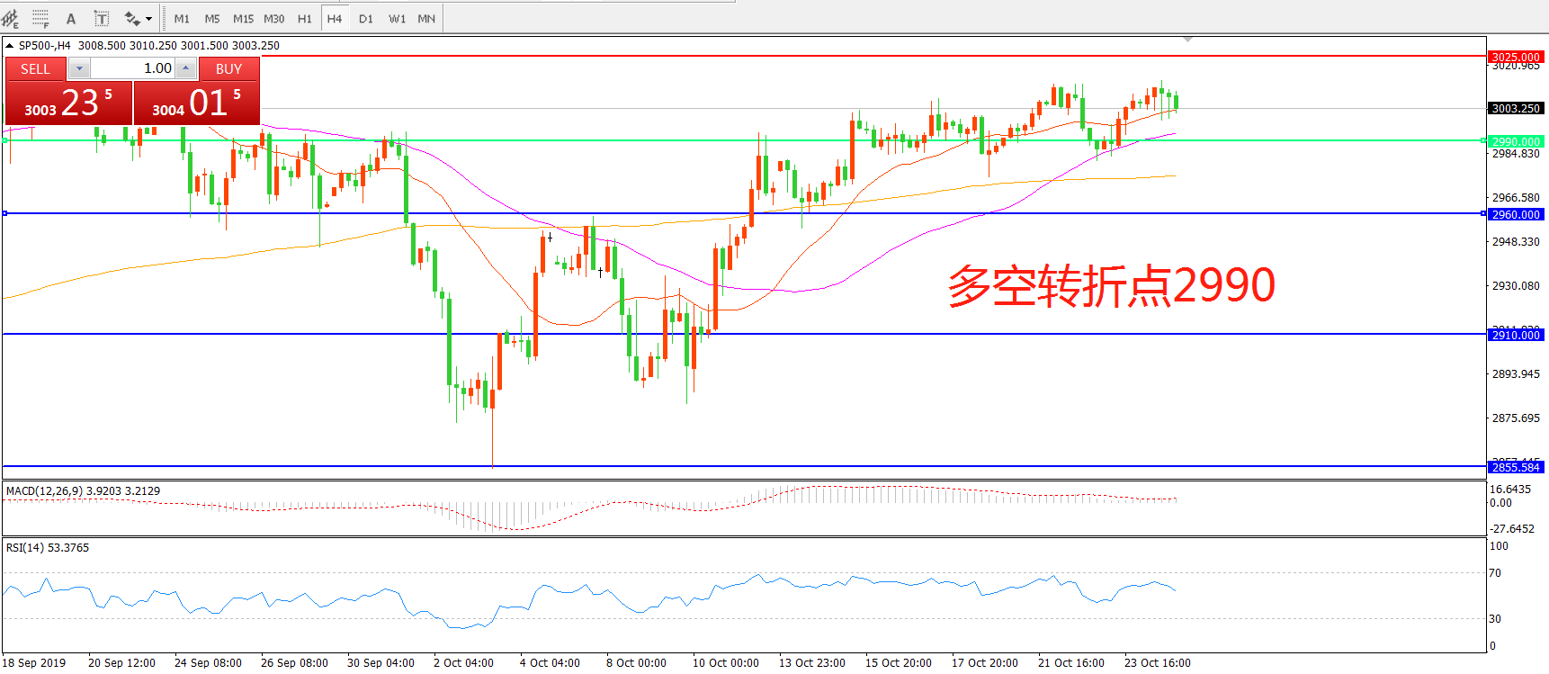 4小时图看,标普500震荡反弹后小幅回落,但整体仍在3000大关之上,均线系统走平,MACD红柱减少,RSI指标向下,日内延续震荡概率较大。