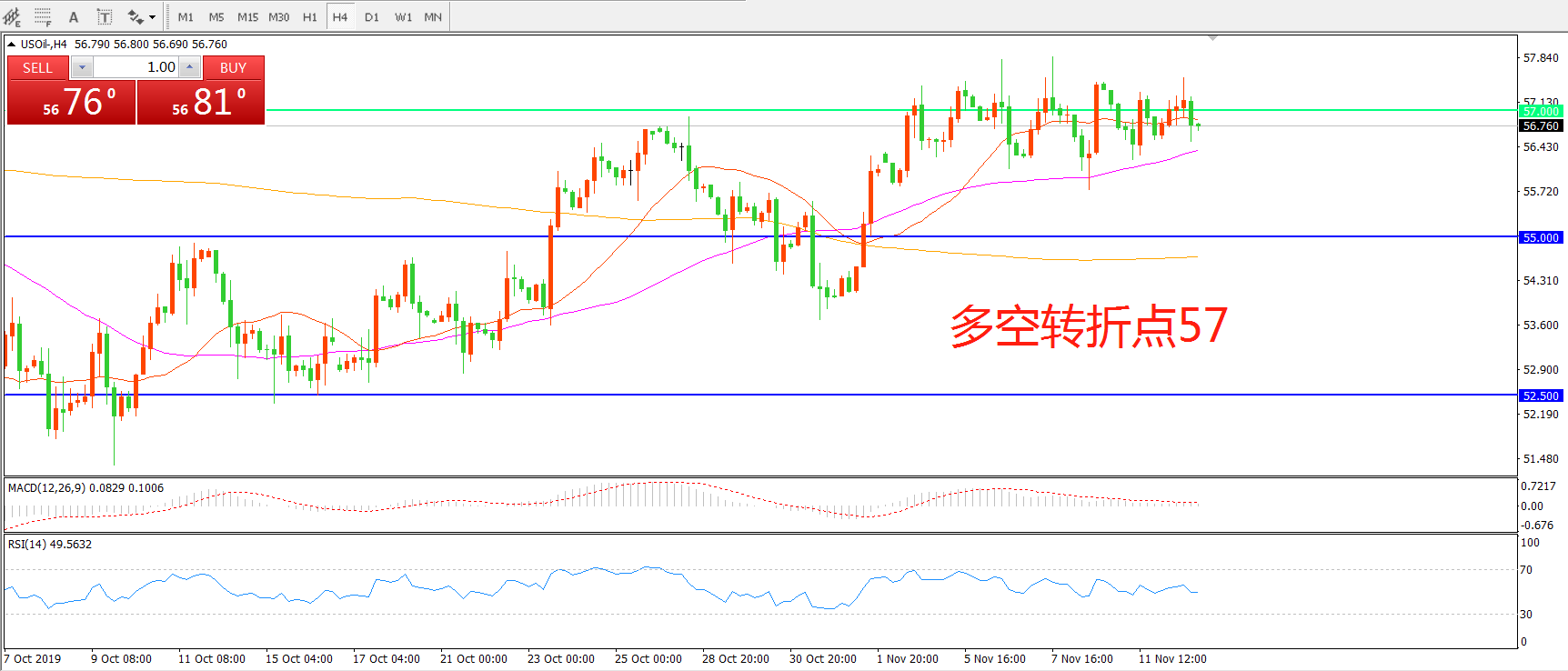 4小时图看,油价延续高位震荡,振幅逐渐收窄,57美金成为多空争夺焦点,均线系统走平,MACD红柱减少,RSI指标走平,日内延续震荡的概率较大。