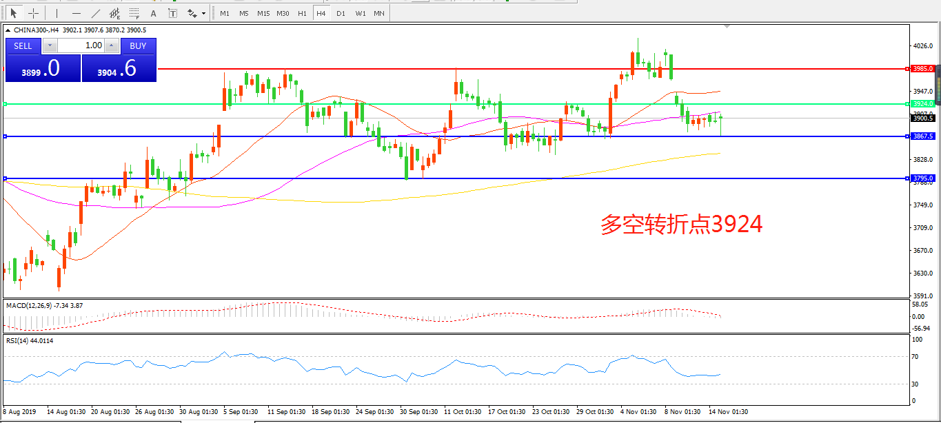 4小时图看,沪深300延续区间震荡且振幅逐渐收窄,3924成为上方阻力,3867.5成为下方支撑,均线系统逐渐走平,MACD红柱增加,RSI指标走平,日内延续震荡概率较大。