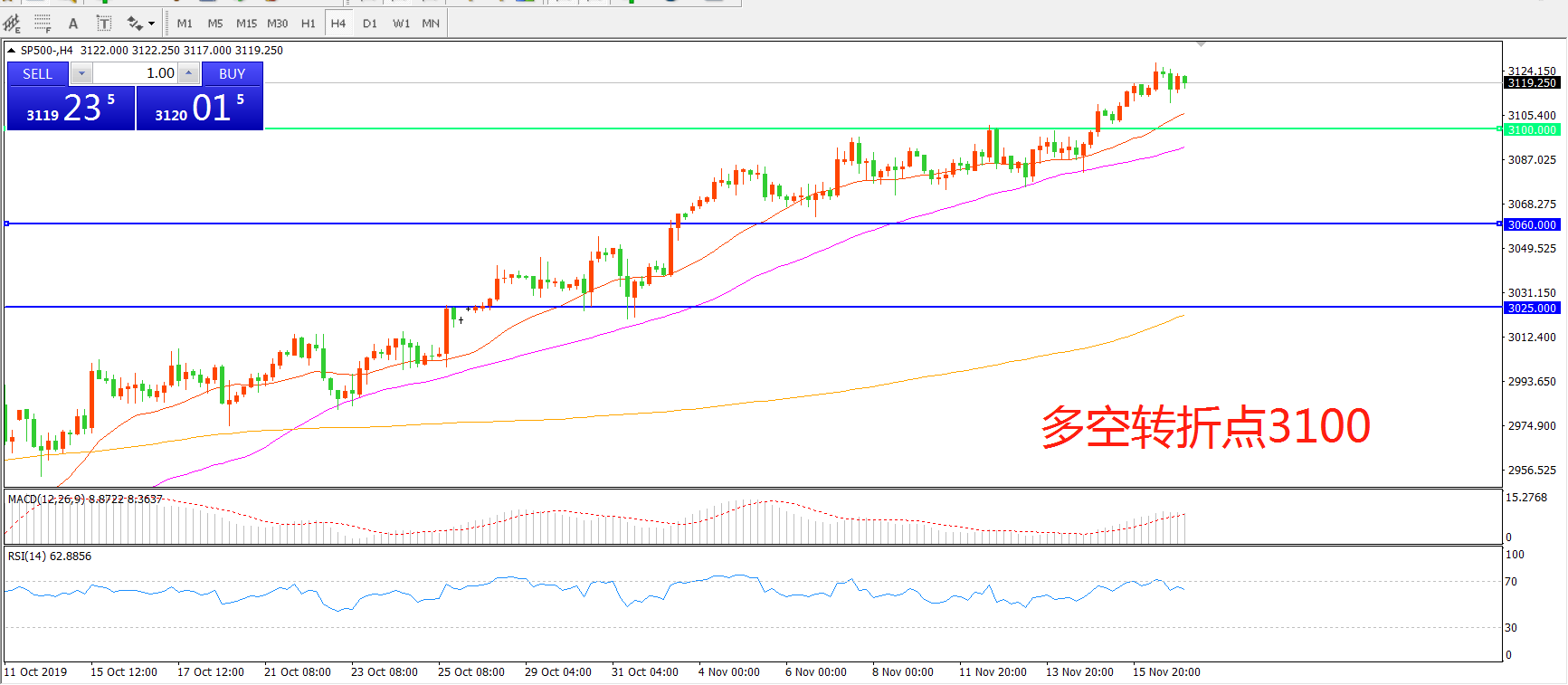 4小时图看,标普500维持震荡上行,多头趋势依然明显,但接连创出新高后,有后继乏力的迹象,均线系统呈多头排列,MACD红柱增加,RSI指标走平,日内震荡上行概率较大,需警惕短期回落风险。