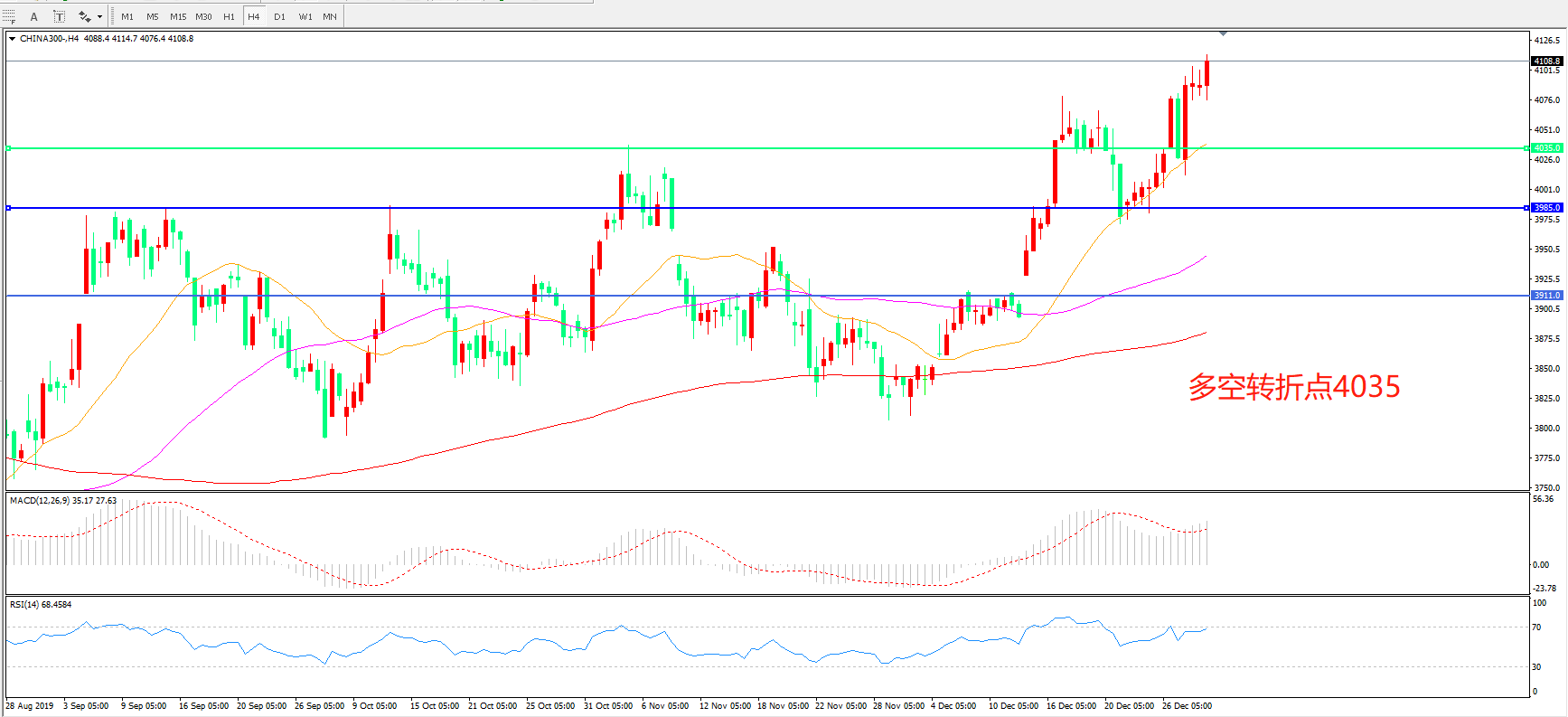 4小时图看,沪深长阳拉升,再创新高,整体表现十分强势,均线系统呈多头排列,MACD红柱增加,RSI指标向上,日内延续上行概率较大。