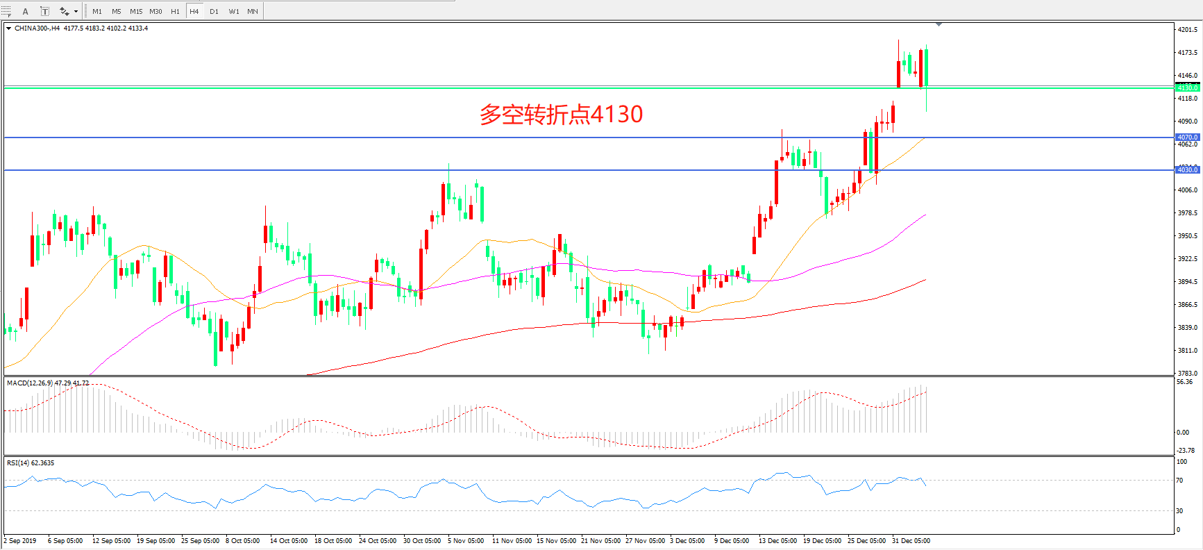 4小时图看,沪深300延续高位震荡,4130仍然是下放明显支撑,均线系统呈多头排列,MACD红柱增加,RSI指标向下,日内延续上行概率较大。