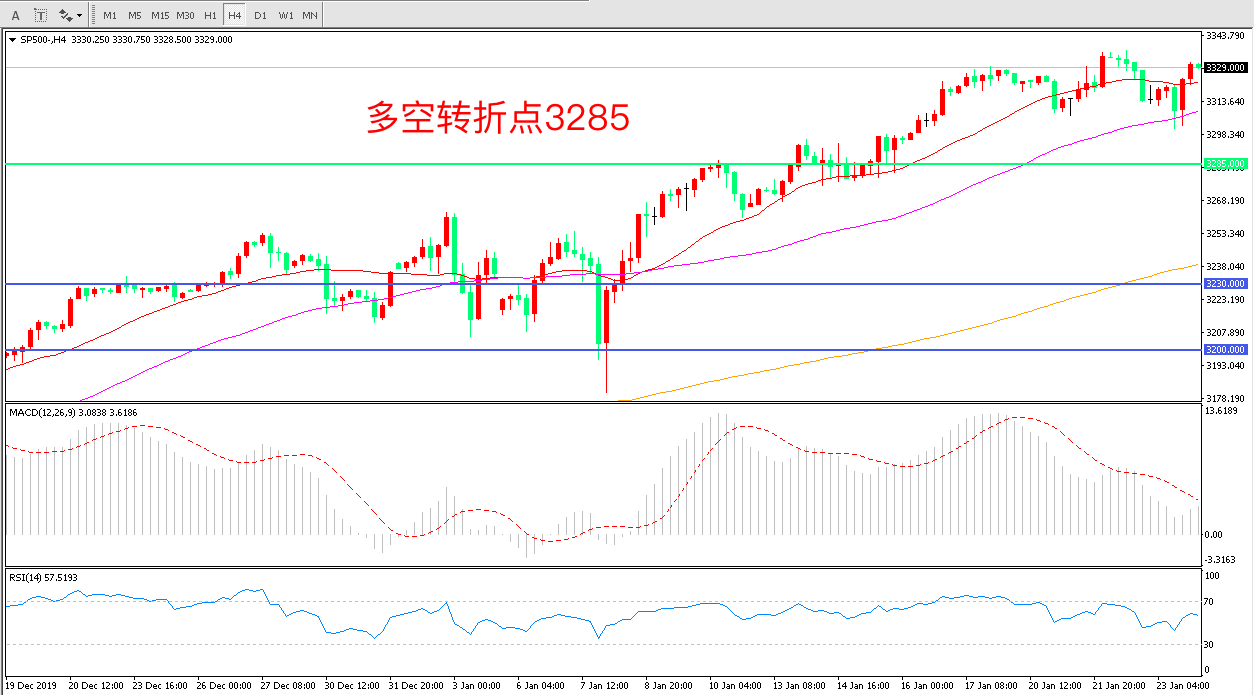 4小时图看,标普500探底回升,走势有所回暖,均线系统走平,MACD红柱减少,RSI指标向下,日内延续震荡概率较大。