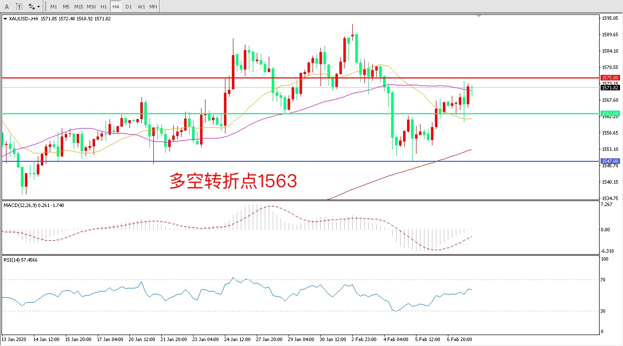 4小时图看,金价震荡反弹,整体走势1575附近,表现强势,均线系统走平, MACD绿柱缩短,RSI指标向上,近期延续上行概率较大。