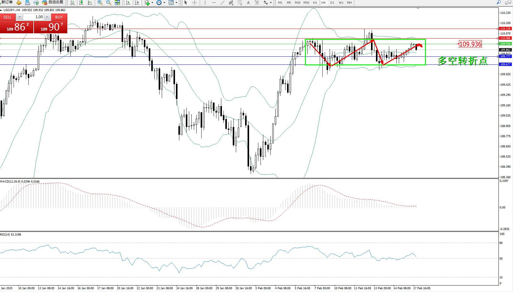 备选策略:109.936上方看涨,目标110.006、110.126