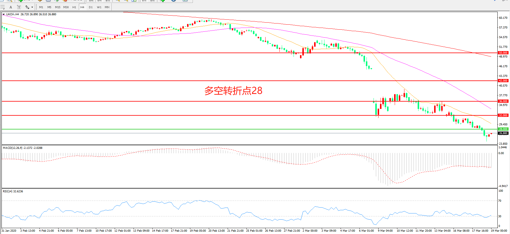 4小时图看,布油延续下行,整体表现低迷,均线系统呈空头排列,MACD绿柱增加,RSI指标走平,日内延续震荡概率较大。