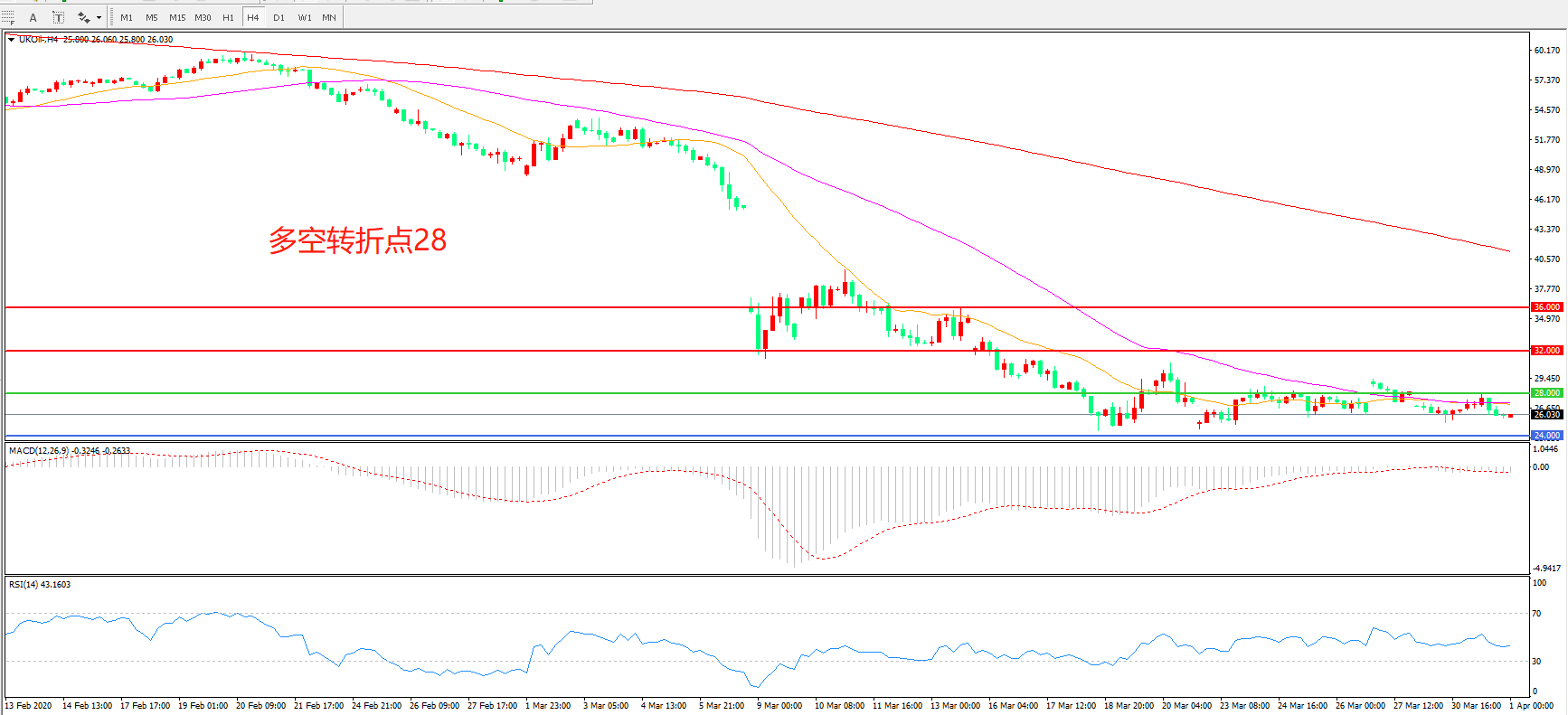 4小时图看,布油延续低位震荡,整体表现低迷,28美元成为短期多空分水岭,均线系统逐渐下压,MACD绿柱减少,RSI指标走平,日内延续震荡概率较大。