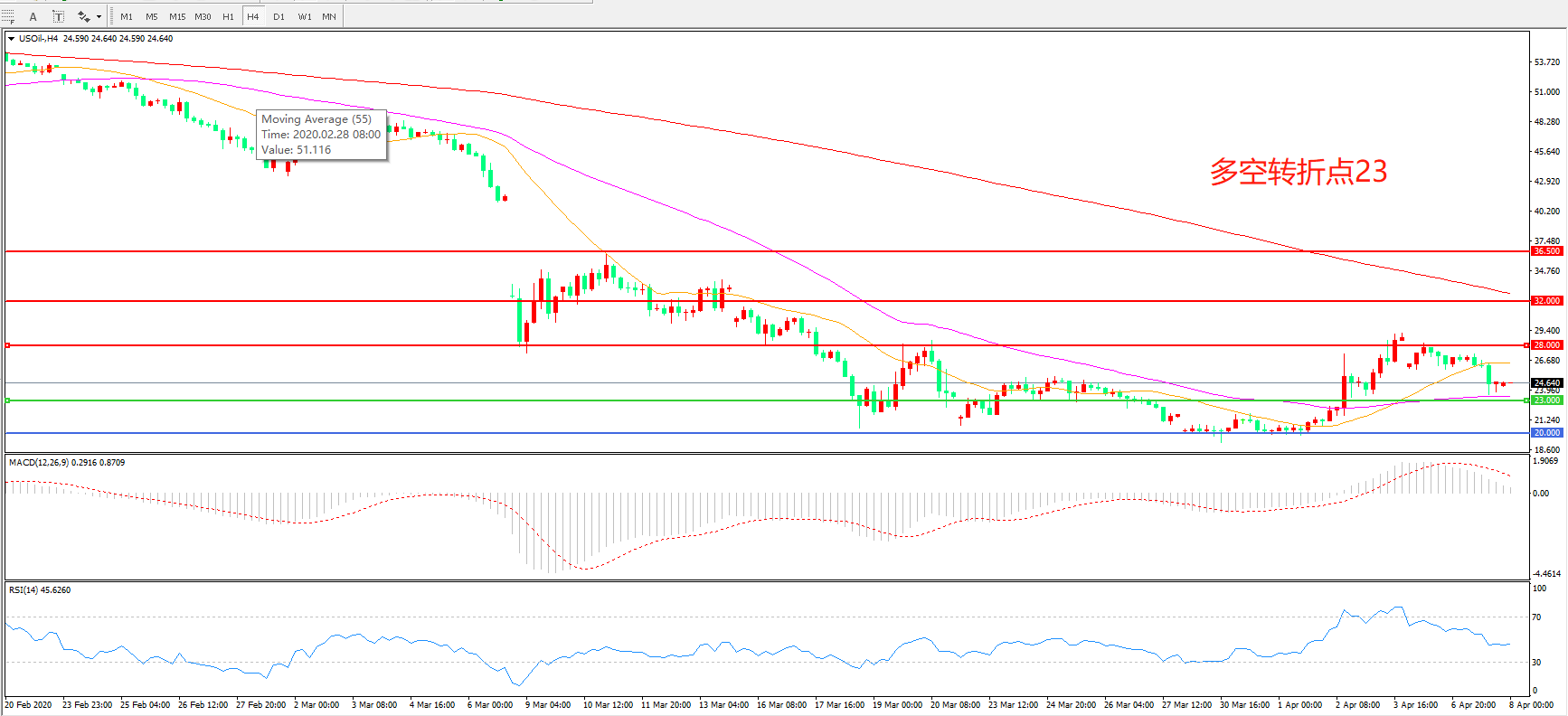 4小时图看,美油维持区间震荡,整体表现低迷,55短期均线成为短期支撑,28美元成为上方阻力, MACD红柱减少,RSI指标走平,日内延续震荡概率较大。