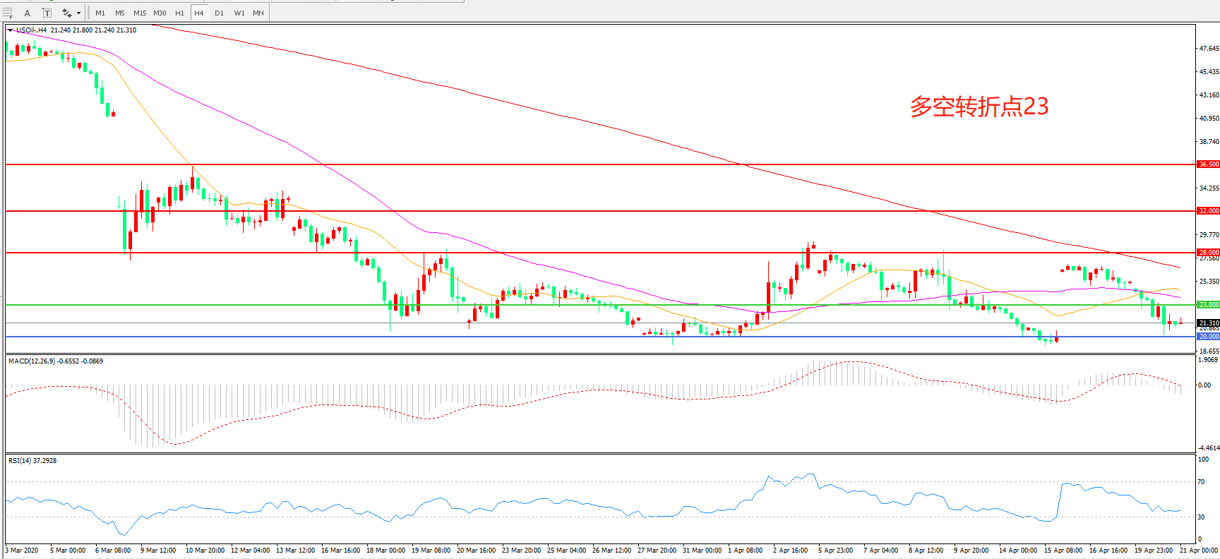 4小时图看,油价震荡下行,整体走势较为低迷,20美元成为短期支撑,23美元成为短期阻力,均线系统走平,MACD绿柱增加,RSI指标走平,日内延续震荡概率较大。