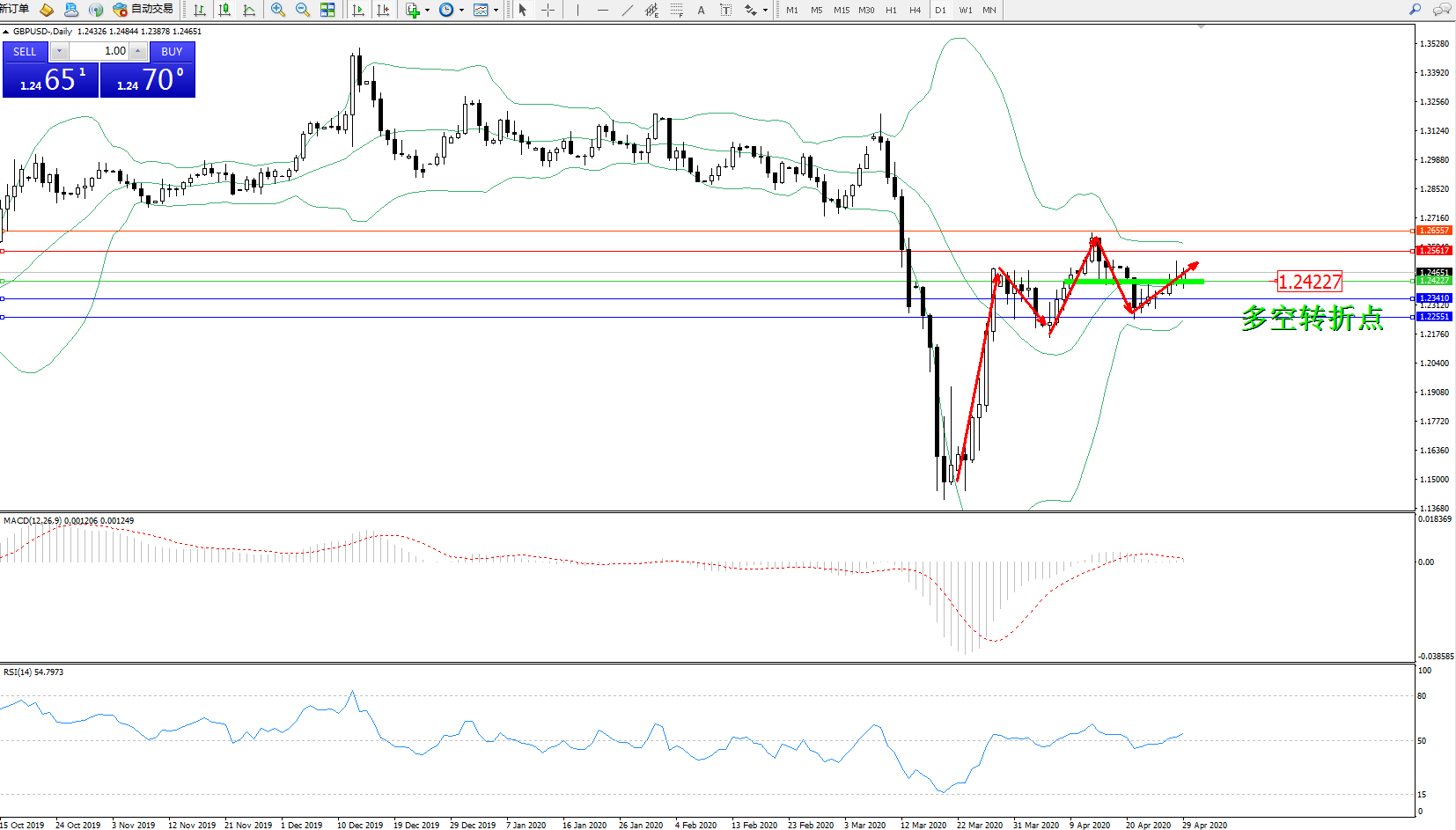交易策略:1.24227上方看涨,目标1.25617、1.26557