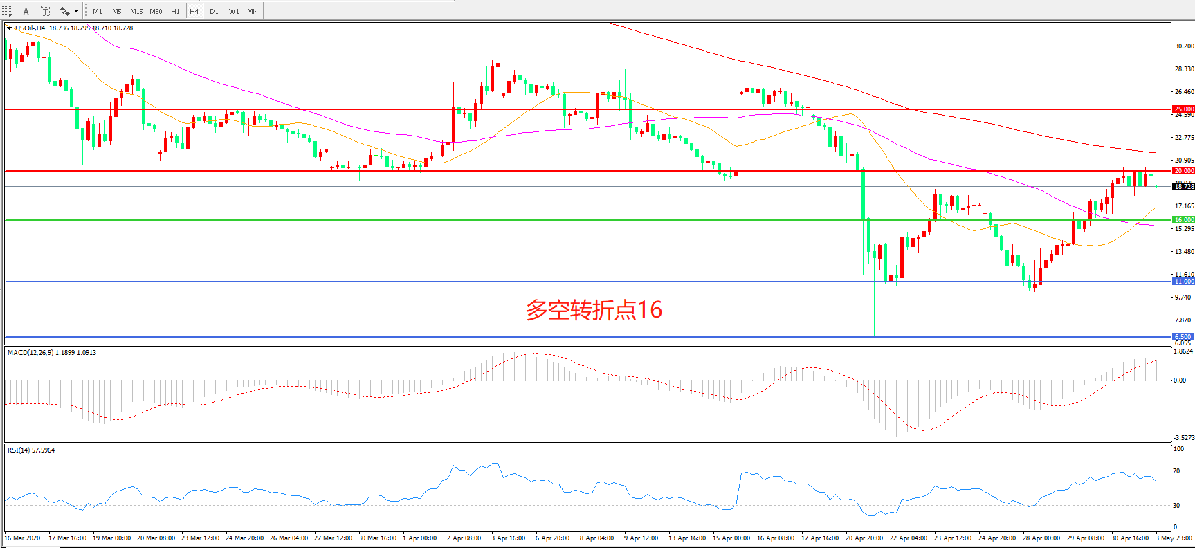 4小时图看,油价震荡上行,暂时受阻于20美元阻力,短期均线上穿形成金叉,MACD红柱增加,RSI指标向上,如能突破20美金阻力,延续上行的概率较大。