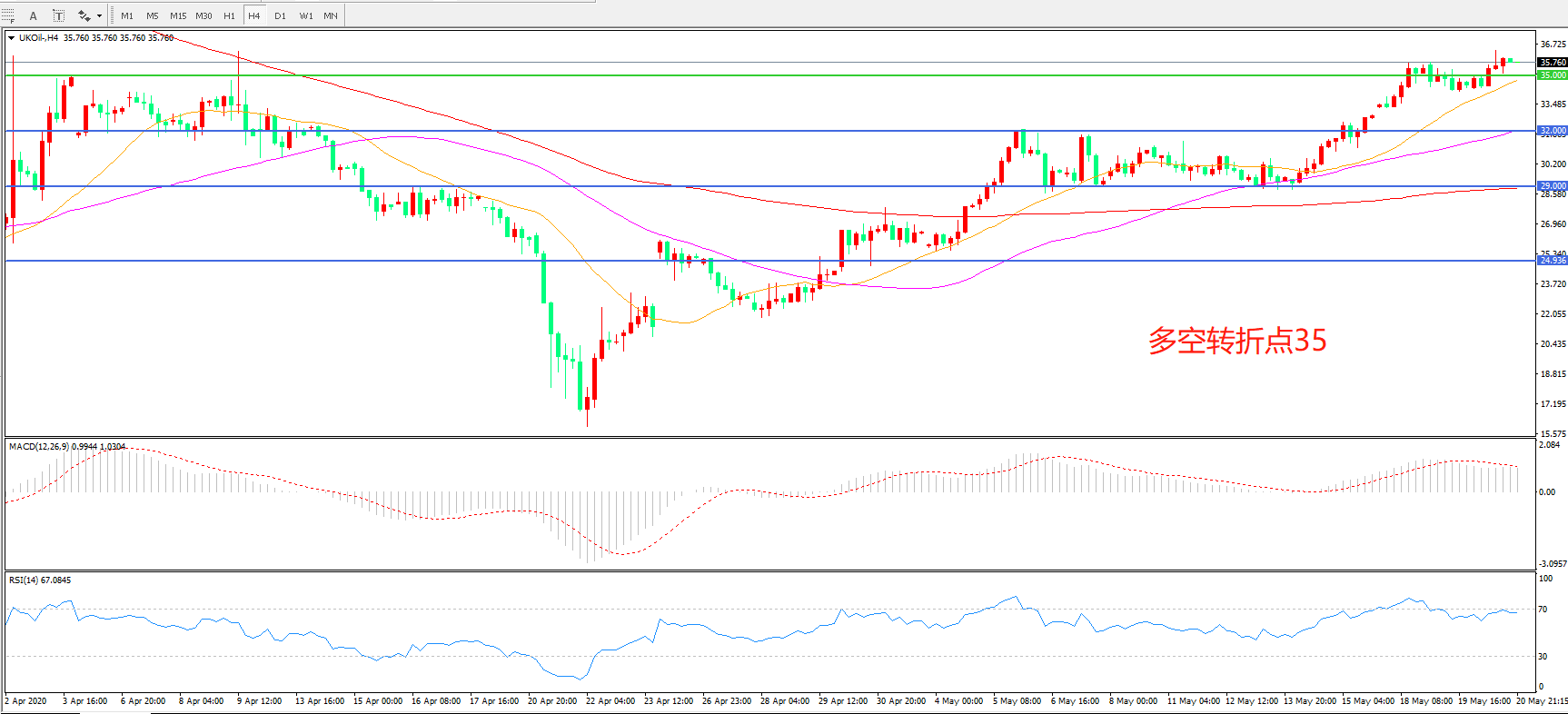 周三(5月20日),美国EIA原油库存意外减少498.20万桶,好于预期,但成品油库存表现不佳,油价涨幅受限。布伦特原油震荡走高,收报35.75美元/桶。高盛表示,全球石油需求的改善以及欧佩克+协议之外的减产速度快于预期,将使6月份石油市场陷入短缺。