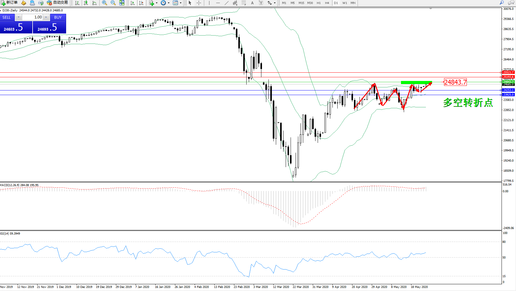 道琼斯指数上交易日收盘下跌9.00点,跌幅0.04%,报24465.16点。美国三大股指周五收盘涨跌不一,本周走势动荡,投资者在对经济重新开放的乐观情绪和贸易局势再度紧张之间摇摆。科技股帮助纳斯达克综合指数跑赢大盘,卡特彼勒和强生对道琼斯工业平均指数构成压力。市场已经出现疲态,考虑到股市的V形回升走势,疲态也是合情合理的。美联储将在5月26-29日以每日50亿美元的速度买入国债,上周为60亿美元/日。随着地缘政治紧张局势再次升温,加剧了人们对已经受冠状病毒大流行重创的全球经济复苏缓慢的担忧。