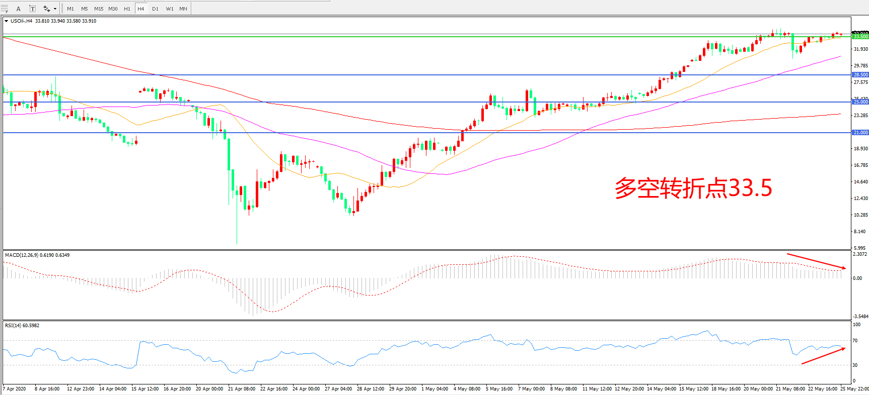 4小时图看,油价延续高位震荡,33.5成为争夺焦点,55周期均线逐步走高,MACD红柱走平,RSI指标向上,日内延续震荡概率较大。