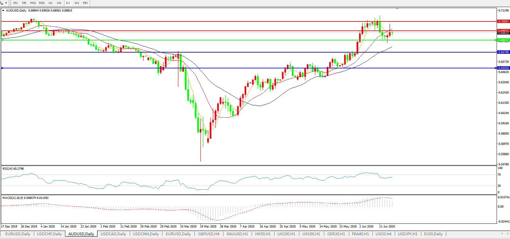 技术面简析:日图短期均线开始下穿长期均线,汇价昨日冲高乏力后回落延续高位整理,MACD运行于0轴上方但量能持续微缩量,RSI缓步走平无明显方向,预计汇价短线大概率将下行修正,短期关注下方0.68关口支撑。