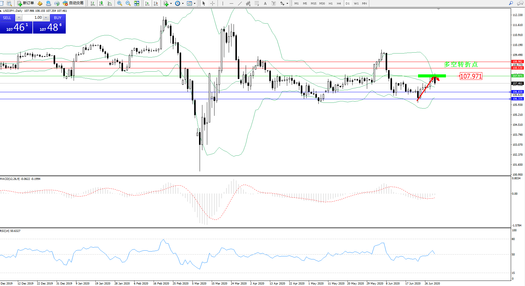交易策略:107.971下方看跌,目标106.830、106.335