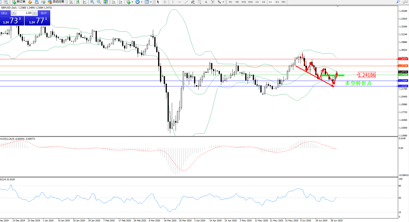 交易策略:1.24186上方看涨,目标1.25739、1.26924
