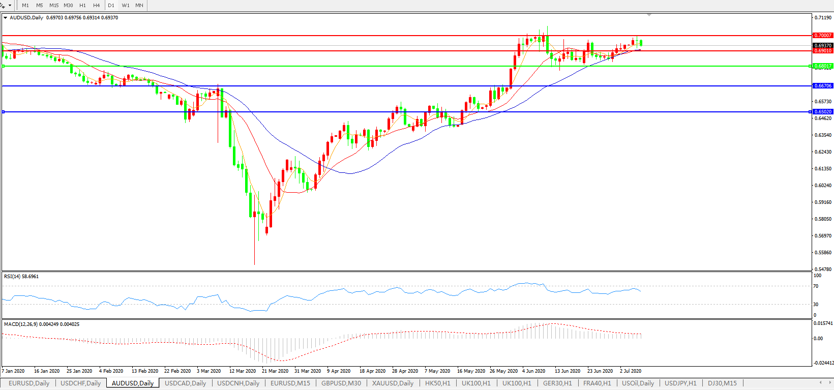 技术面简析:日图均线维持发散上行态势,汇价昨日小幅回落整理,MACD运行于0轴上方但量能持续缩量,RSI小幅走弱,预计汇价短线大概率将继续上攻,关注0.7000 关口压制。