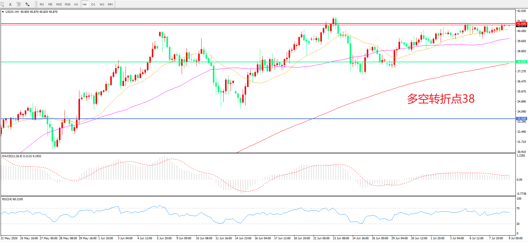 周三(7月8日),美国EIA原油库存增加565.40万桶,远高于预期减少318.9万桶,成品油库存表现喜忧参半,美国WTI原油延续高位震荡,收报40.87美元/桶。进入2020年下半年的全球经济依然受到新冠肺炎疫情的沉重打击,企业复工复产看上去摇摇欲坠,整体来看,油价近期持续交投于40美元附近,多空相对焦灼,等待突破后再顺势操作较为可行。