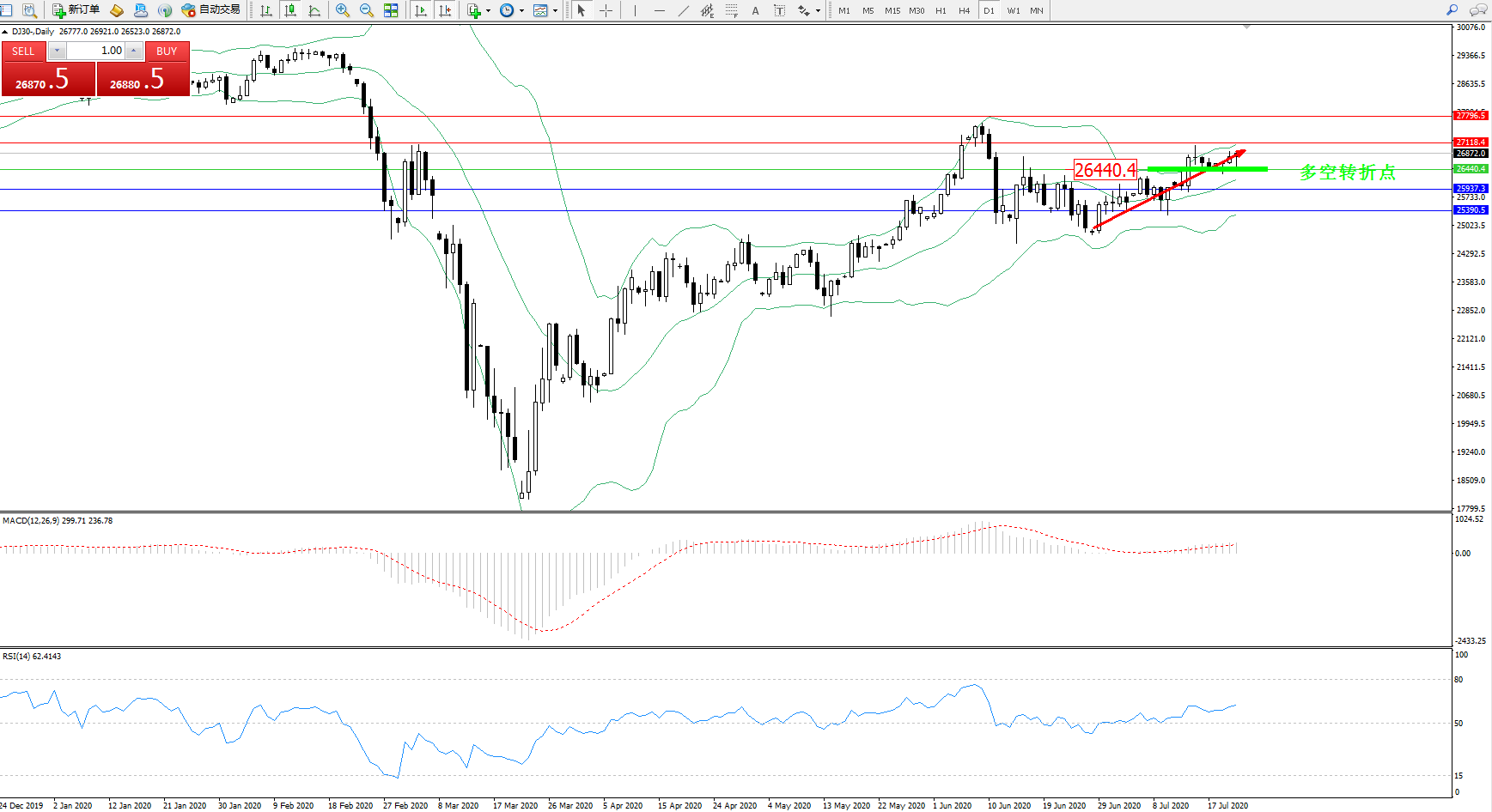 技术点评:长时间纠结于布林带指标通道内持续窄幅震荡走势中,多次试探上轨附近节点后,终究多头动力破位上扬,但后续动力略显不足,突破布林带指标上轨附近关键节点后有回撤迹象,关注26440附近转折点,布林带指标呈收口走势后有张口态势,关注上方转折点,MACD指标长时间纠结于0轴线附近弱势徘徊有上扬迹象,RSI指标处于50均衡线上方维持窄幅整理有开始有拉升上移走势;