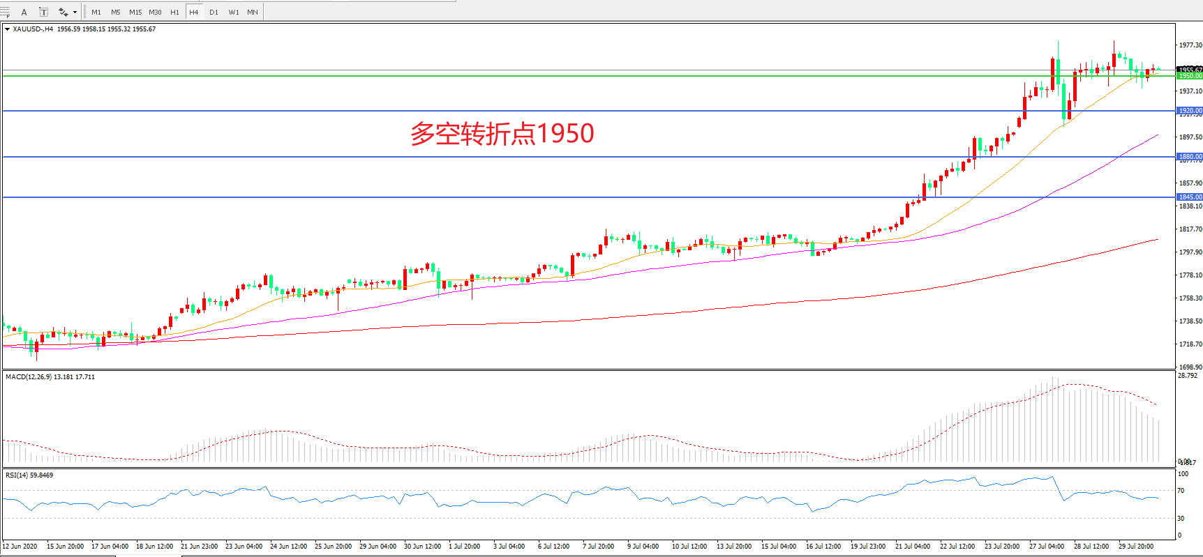 周四(7月30日),资本市场经历连番冲击,美国二季度美国GDP下滑32.9%,创下二战以来最大单季降幅纪录,金价一度受到提振,但始终未能突破,最终收报1956.20/盎司。考虑到黄金已经非常接近2000美元大关,获利回吐情绪开始升温,这令短线金价震荡可能放大。