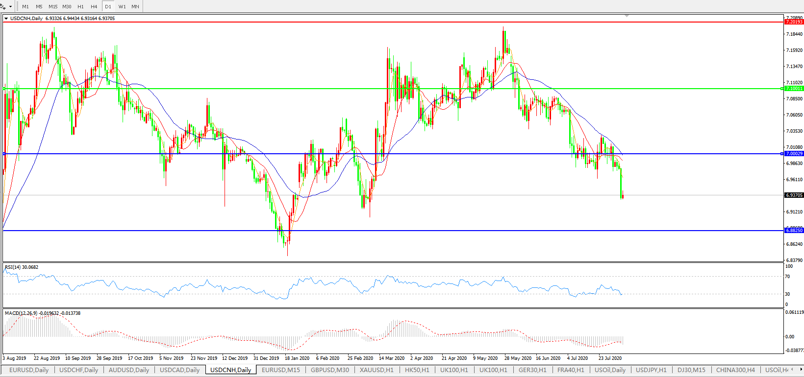 美元兑人民币USDCNH 日线图: