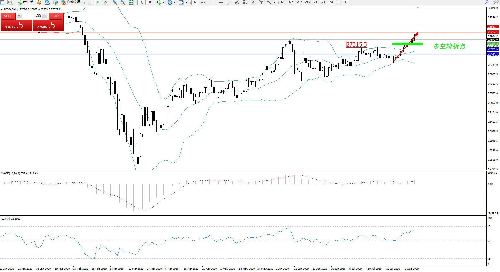 道琼斯指数8月11日(周二)收盘下跌104.50点,跌幅0.38%,报27686.91点。美股三大指数全线收跌,科技股跌幅领先;美国10年期国债收益率涨至0.656%,升穿50日均线。伴随着美债收益率大涨,美股银行股集体上涨。市场仍关注财政刺激措施、疫苗研发以及国际紧张局势等消息。市场分析认为,一旦有迹象表明冠状病毒疫情最严重的时期已经过去、经济可能走向更全面的重新开放,资金将从近期急剧上涨的热门增长导向型股票转向更具周期性的股票。全球新冠病毒确诊人数超过2000万,美国就占到四分之一,佛罗里达州死亡病例再创新高。疫情持续蔓延预示在夏季用车高峰结束后需求将转弱。在美国参议院一名高级官员表示,美国国会就针对新一轮大流行援助计划的磋商没有取得进展后,风险偏好恶化。