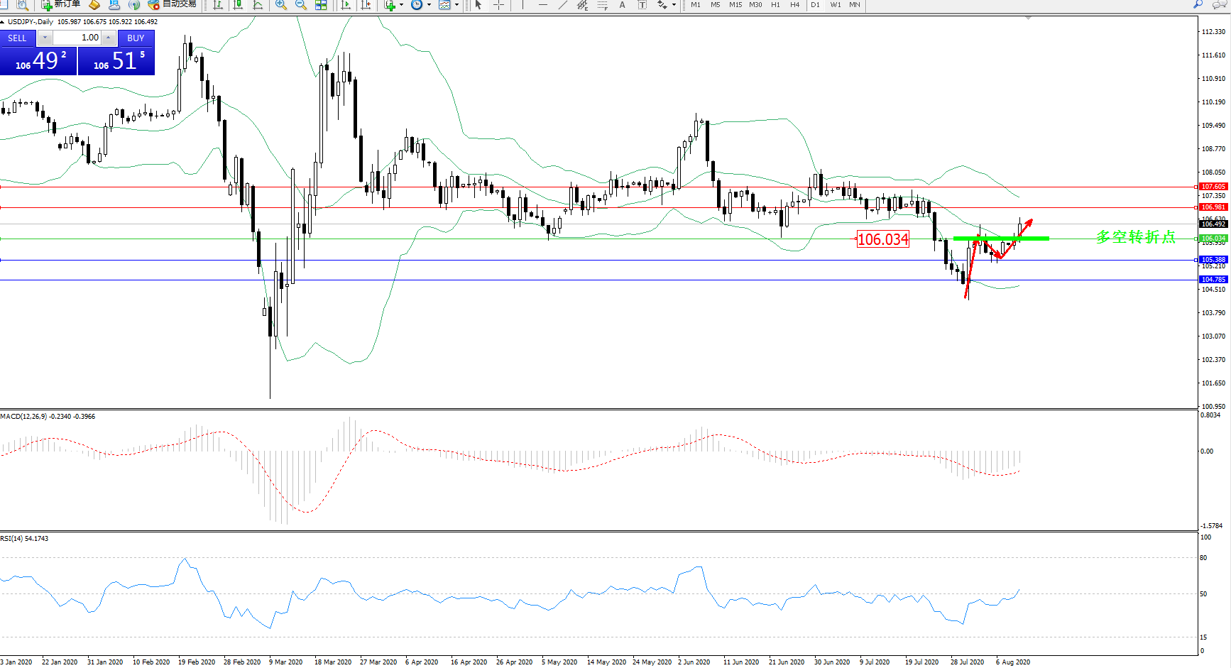 美元兑日元上涨0.5%至106.49,盘中一度触及三周高位106.68;美国国会就针对新一轮大流行援助计划的磋商没有取得进展后,风险偏好恶化;由于美国国债收益率上升,日元跌至两周多以来的最低水平;避险买需消退一度推动美元兑日元创一周新高,而俄罗斯宣布注册全球首个新型冠状病毒疫苗,令市场风险偏好情绪升温,当前美元兑日元的走势趋势也意味着汇价终将摆脱前期因美元承压仍出现的阶段性低谷,重返106-108这一盘整区间之中。后市,在全球风险情绪消长的带动下,美元兑日元料恢复走势的同步性,因而持续横向盘整仍是中短线行情的趋势所在。