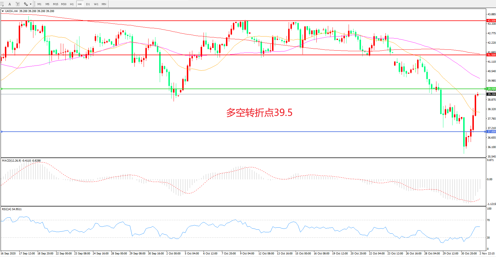 4小时图看,油价低位连续拉升,短期表现有所回暖,39.5美元成为上方阻力,均线系统走平,MACD绿柱缩短,RSI指标走平,日内延续震荡概率较大。