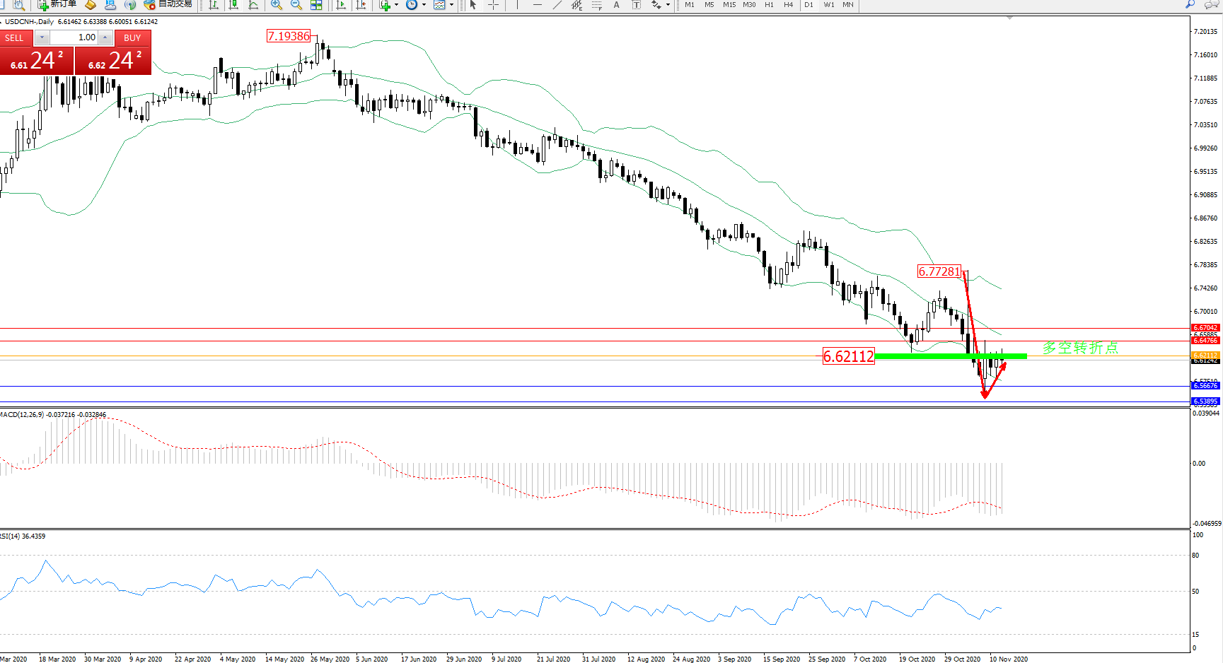 美元人民币USDCNH——日K线图显示: