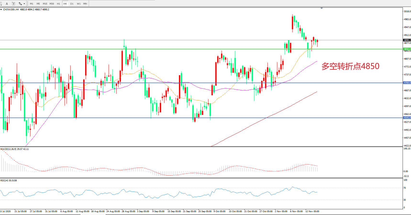 4小时图看,沪深300延续高位震荡,短期走势有所回暖,21周期均线成为支撑,MACD红柱增加,RSI指标向上,日内延续上行概率较大。