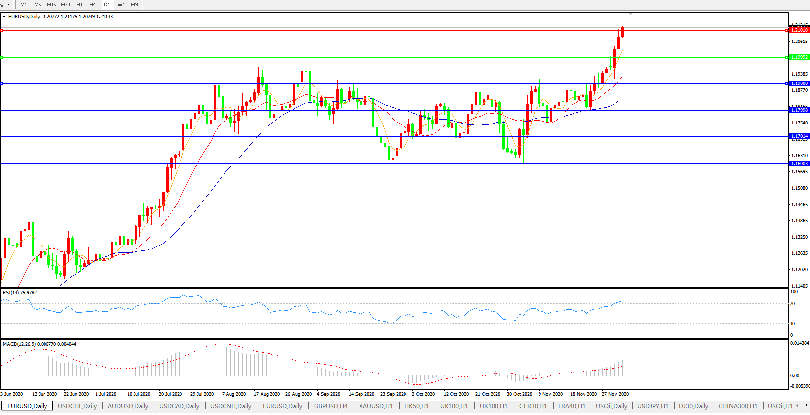 在欧元兑美元汇价隔夜跳涨升破9月初的高位,在1.20关口上方站稳后,德国商业银行进一步看高欧元汇价前景,一方面因对手盘美元指数近期颓势难以化解,另一方面欧元兑美元在之前持续上行之后,也已经在技术上打开了持续上行的通道。该行指出,欧元兑美元短线上行目标将上看1.2145,这是2018年2月高点1.2555至今天3月低位1.0636这波跌幅的78.6%回撤位水平,而在这之上,中期上行目标则进一步上看200个月均线切入位1.2622。下方短线支撑在1.1906,而若进一步跌破1.18关口,以及55日均线切入位,则意味着短线升势的反转。