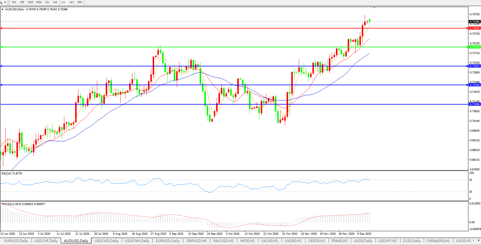 交易策略:0.7400上方看涨,目标0.7500、0.7600
