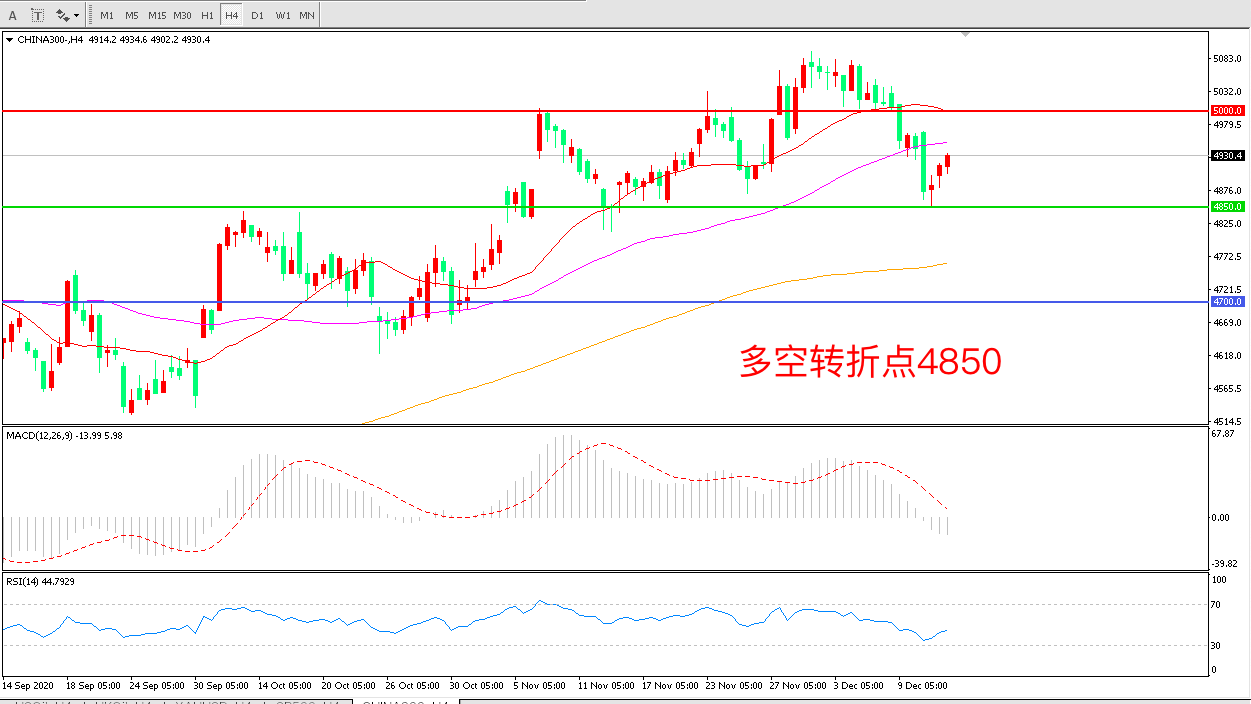 4小时图看,沪深300以4850为依托小幅反弹,短期表现有所回暖,区间震荡迹象明显,21周期均线成为上方阻力,MACD红柱减少,绿柱增加,RSI指标向上,日内延续震荡概率较大。