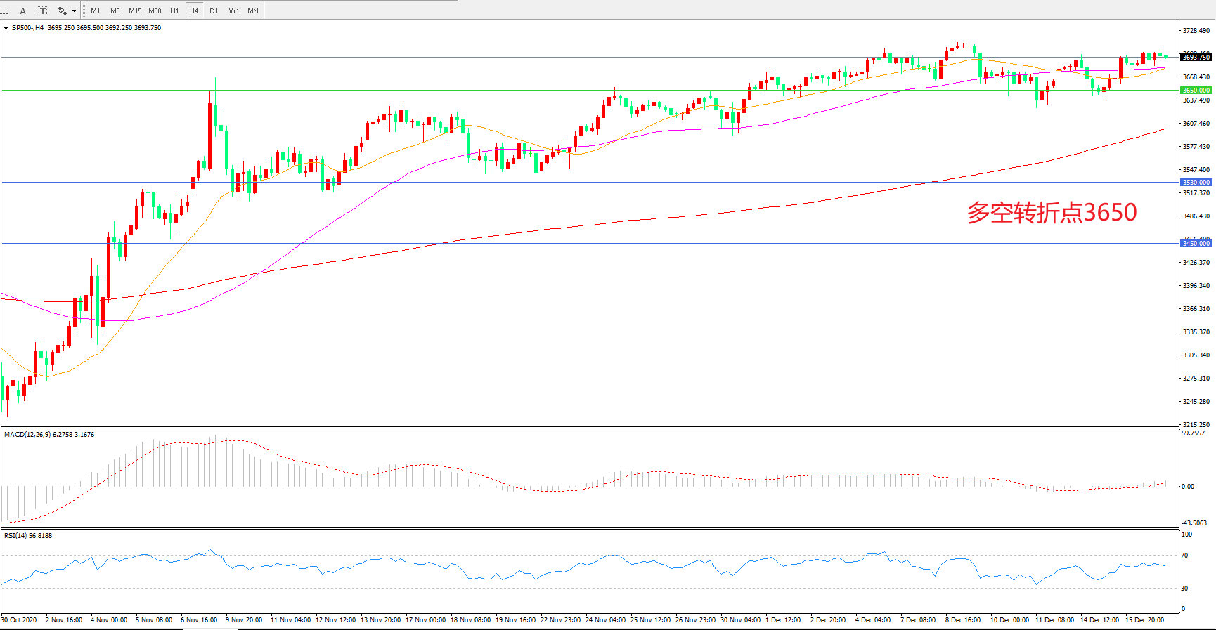 4小时图看,标普500触碰3650支撑后快速反弹,短期表现较为强势,均线系统走平形成下方支撑, MACD红柱增加,RSI指标走平,日内延续震荡概率较大。