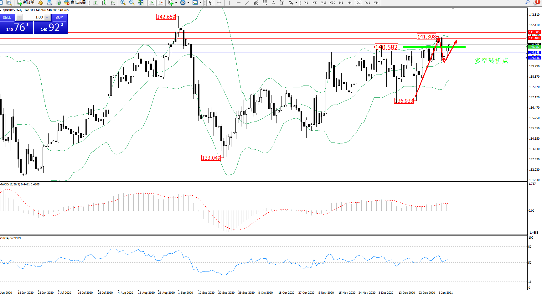 英镑兑日圆处于140.765附近高位缓慢震荡新的国家封锁将在冬季加深经济低迷。预计英国经济在2020年第四季度将再次收缩约-2.5%,2021年第一季度将出现更大幅度的收缩,但不太可能像去年第一次封锁时那么严重。双底衰退将加大英国央行的压力,要求其最早在2月份的下次政策会议上推出进一步的货币宽松政策。鉴于出台更多刺激措施的选择越来越有限,有关英国央行推出负利率可能性的猜测将越来越多。外界揣测英国央行可能较早引入负利率,以对抗第三次疫情封锁给经济造成的打击。货币市场目前预期英国央行会早在5月将利率降至负值,在上月刚达成英退贸易协议后预期的时间是8月。