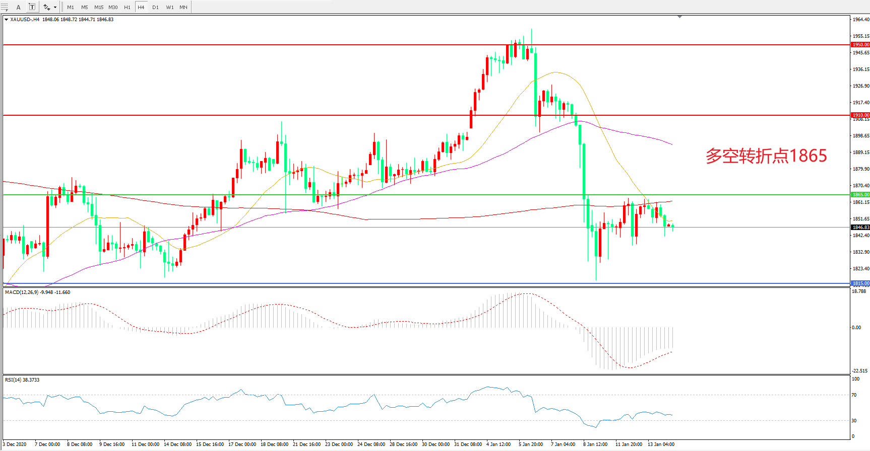 周三(1月13日),美元指数上演V型反转,在亚盘时段下跌后,美盘时段大幅上涨,升破90.40,现货黄金受到打压,小幅回调,收报1847.87美元/盎司。值得欣喜的是美债收益率创五周最大降幅,长期收益率上升的现象可能只是暂时的调整,黄金市场最大的警报暂时消除。