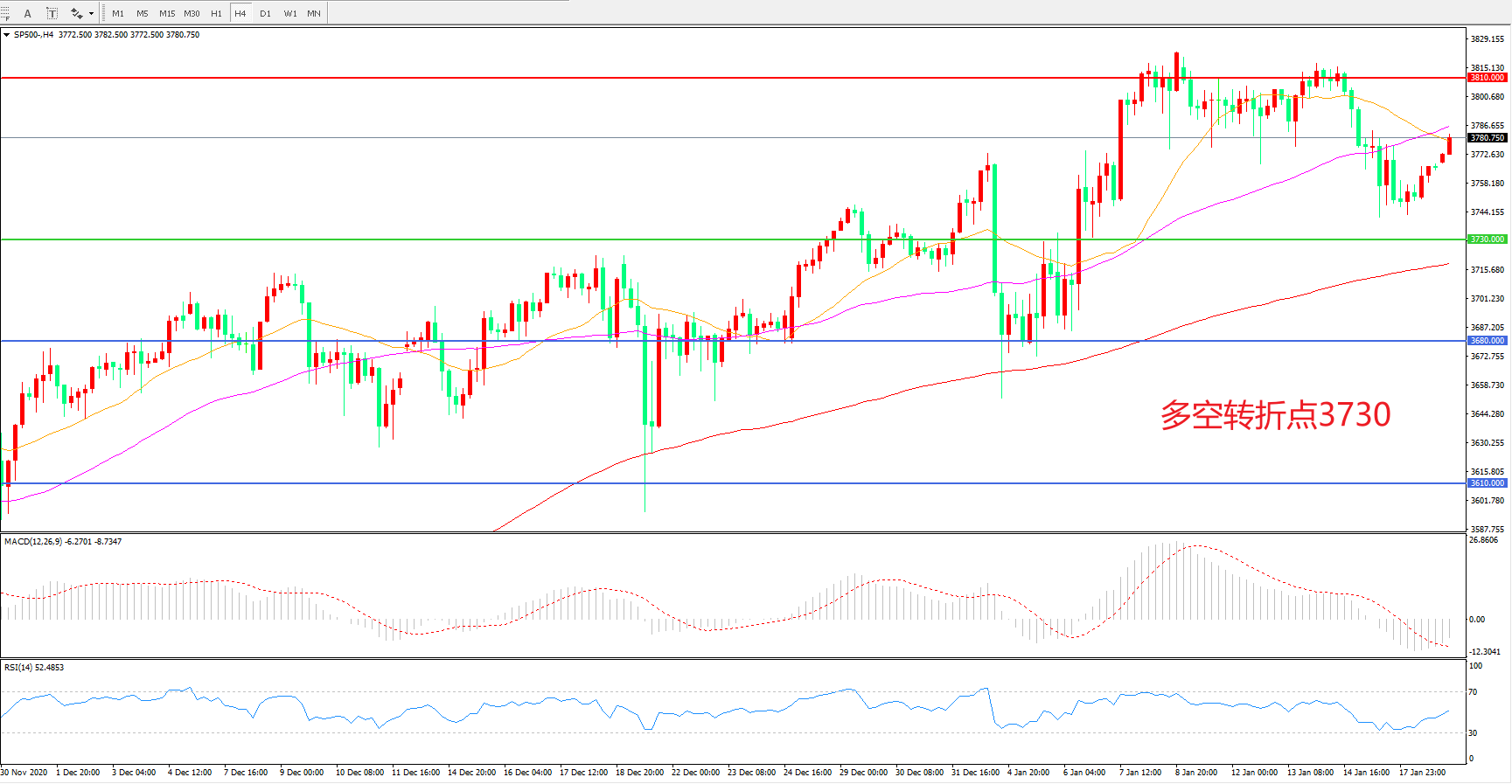 4小时图看,标普500触碰3810阻力后震荡回落,上行趋势遭到破坏,3730成为短线支撑,均线系统走平,MACD绿柱缩短,RSI指标走平,日内延续震荡概率较大。