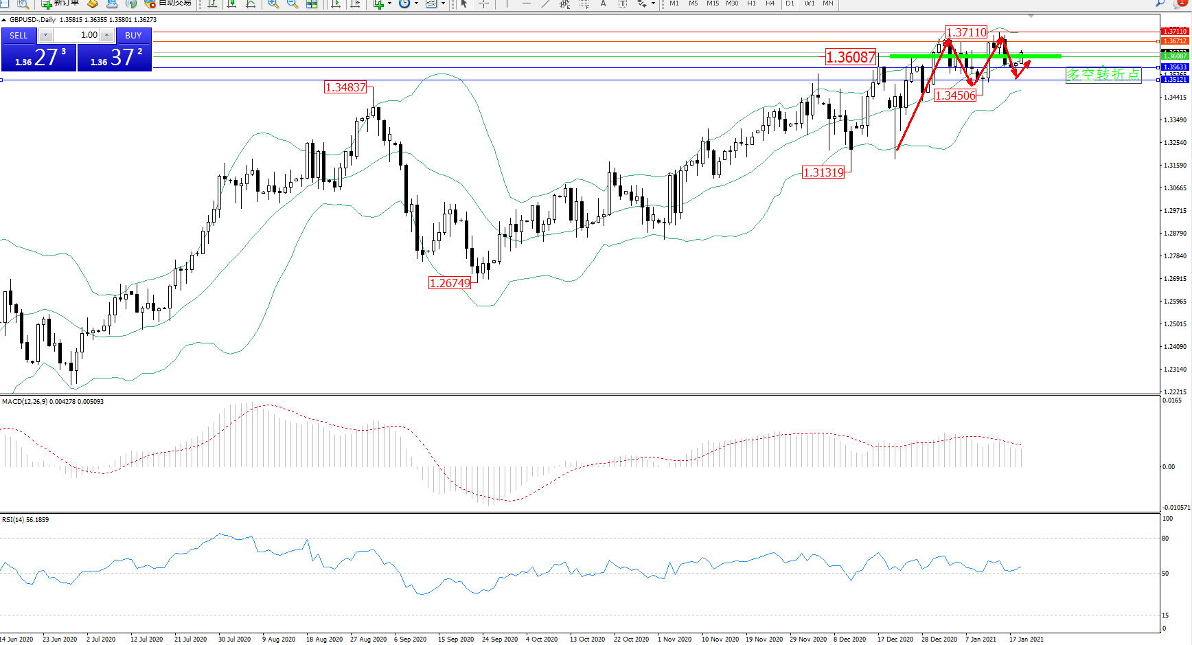 交易策略:1.36087上方看涨,目标1.36712、1.37110