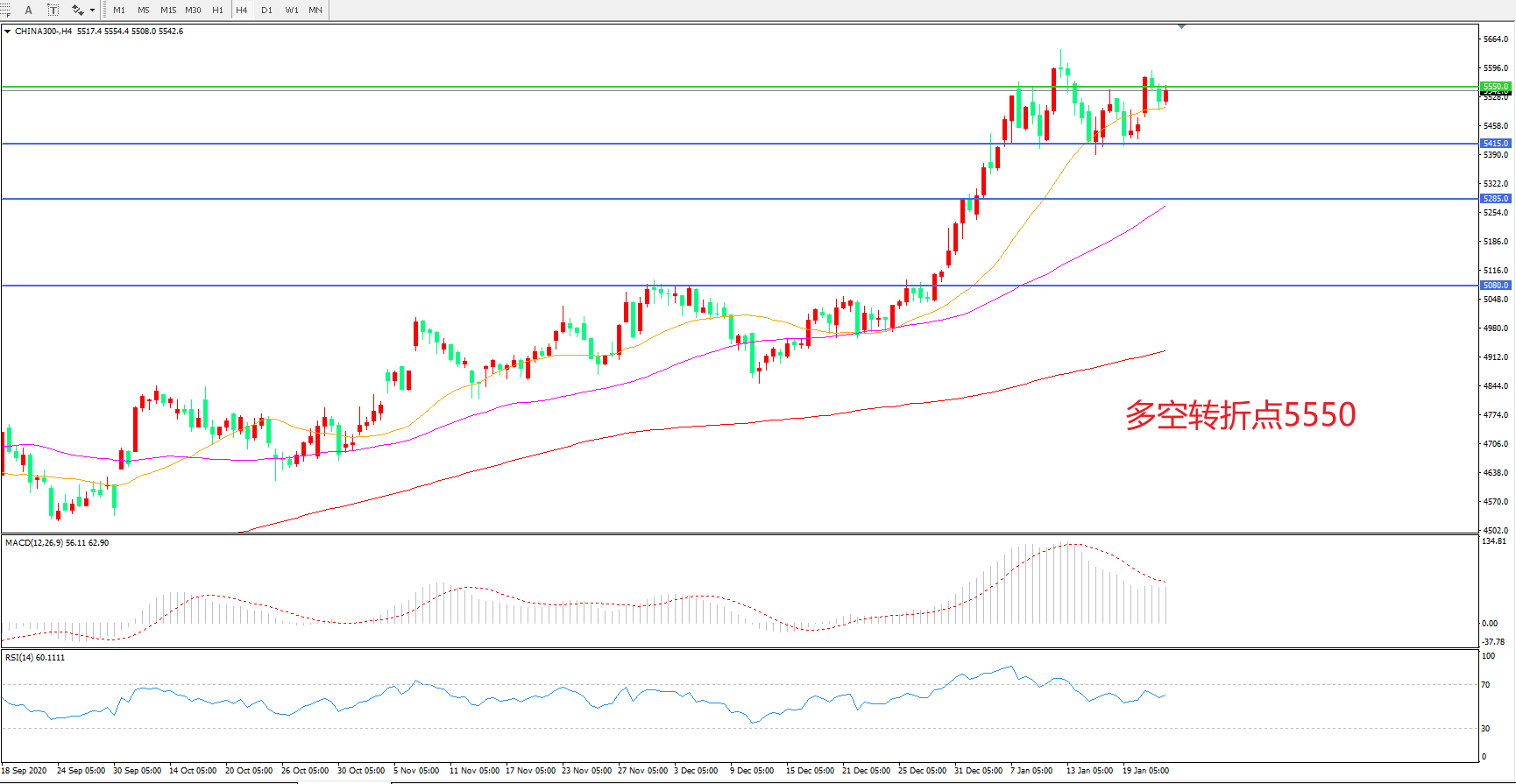 4小时图看,沪深300延续高位震荡走势,短期走势偏强,5550成为多空分水岭,5415成为短线支撑,均线系统逐渐走平,MACD红柱增加,RSI指标走平,日内延续震荡概率较大。